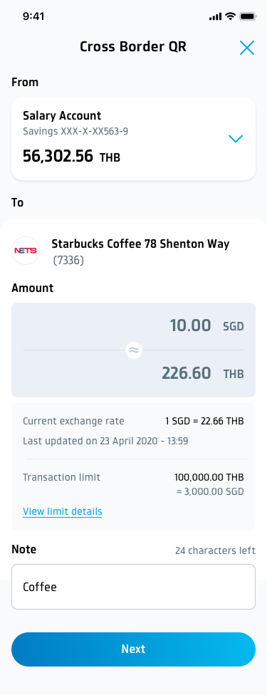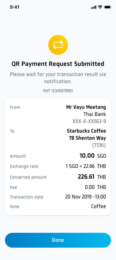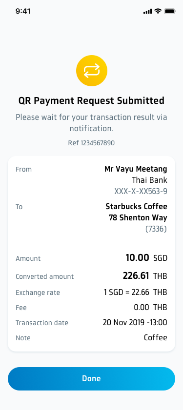 In one of the examples as shown below, the screen depicts the end of the flow of a user making an international payment when he is overseas. In this case, Mr. Vayu is a Thai resident on a holiday in Singapore and making a payment in one of the Starbucks outlets in Singapore.