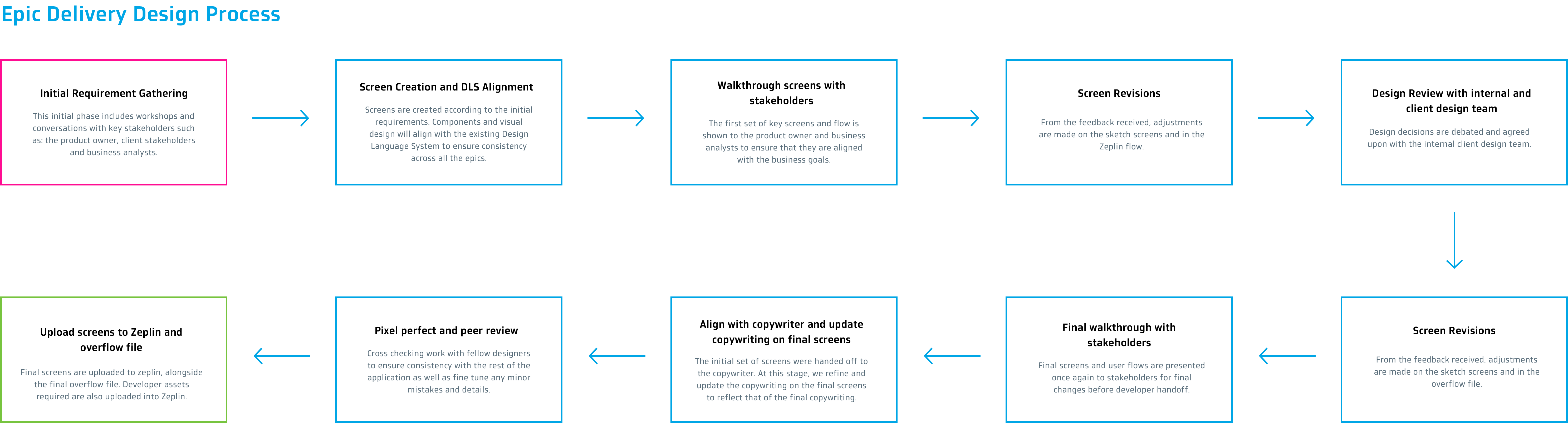 Working closely with the Business Analysts (to challenge the business flow and ensure that it has the users in mind) and Visual Designer (to ensure consistency with the Design Language System *DLS), I proceeded to create the screens for this epic.