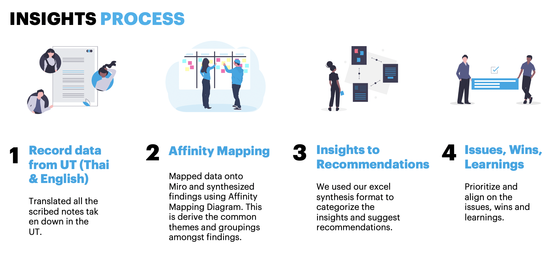 This was how we tackled the data collection -> insights process of the UT. One of the key challenges was that the UT had to be conducted in a bilingual way, hence for each set of data, we had to ensure the translation was accurate and precise.